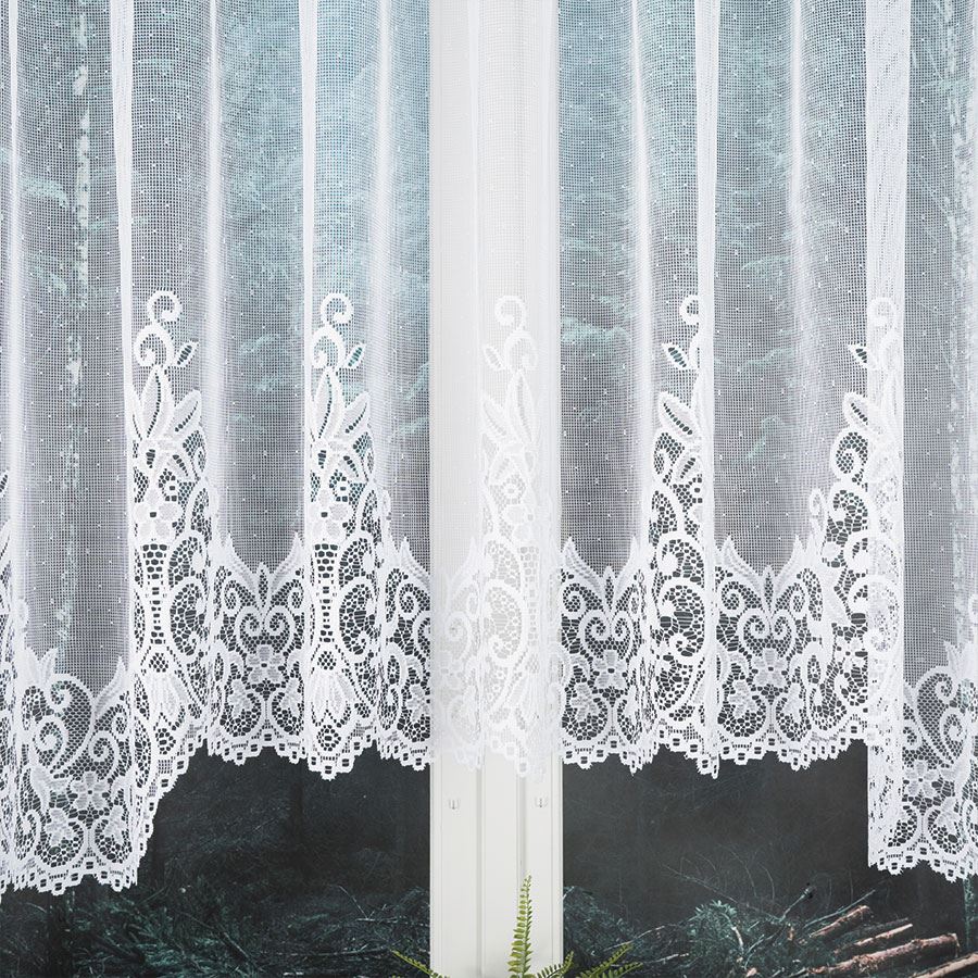 • Wzór: Delikatna firana z klasycznym wzorem na dole.
