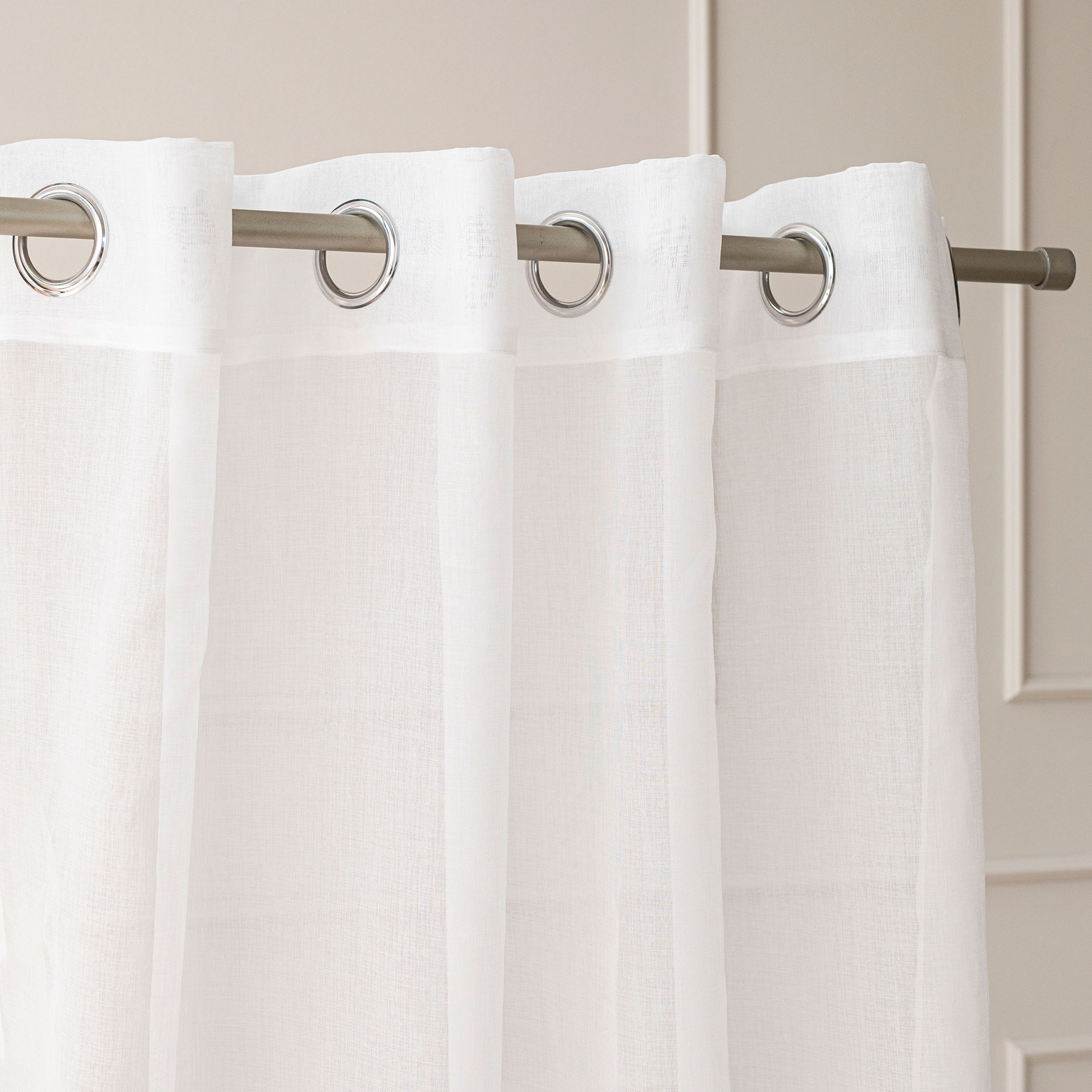 - Uniwersalny styl – klasyczny biały kolor i gładka struktura tkaniny sprawiają, że firana pasuje do każdego wnętrza, niezależnie od stylu.