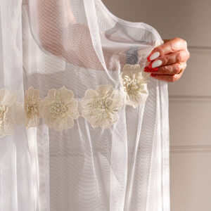 Firanka Isen to wyjątkowy model stworzony z lekkiej, transparentnej siateczki o delikatnym splocie, która pięknie przepuszcza światło i nadaje wnętrzu świeżości. Jej największą ozdobą jest pas efektownych, przestrzennych kwiatów w odcieniu ecru. Każdy kwiat jest misternie wykonany – z warstwowych płatków, subtelnych haftów i drobnych perełek w centrum, które dodają dekoracji szlachetnego blasku.