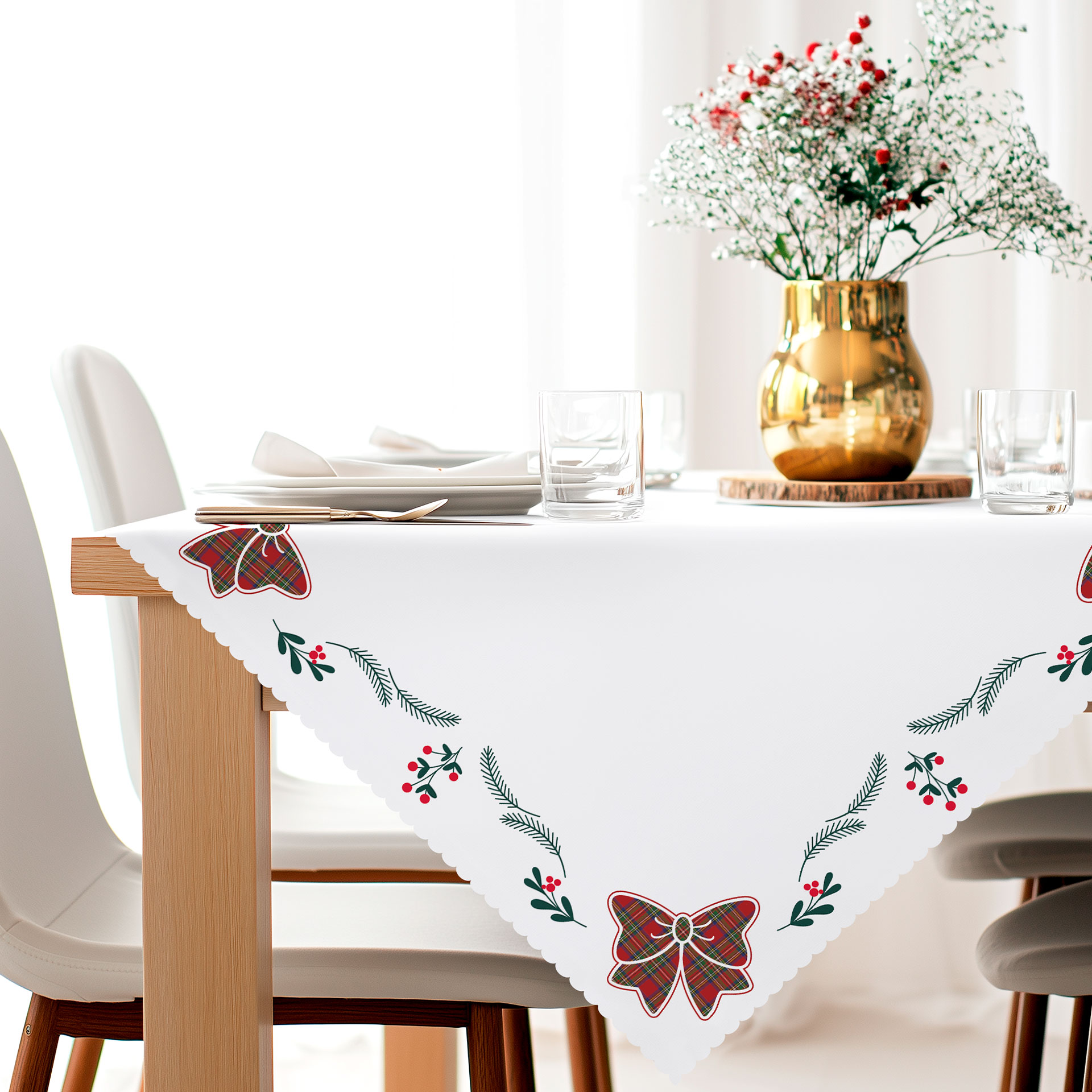 Wprowadź do swojego wnętrza świąteczny klimat z uroczym serwetą KOKARDA SZKOTI. Ten elegancki dodatek łączy klasyczną biel z wyrazistymi, bożonarodzeniowymi akcentami. Centralny punkt stanowi efektowna kokarda w szkocką kratę, otoczona zielonymi gałązkami a także czerwonymi jagodami, które przywołują atmosferę zimowych świąt.