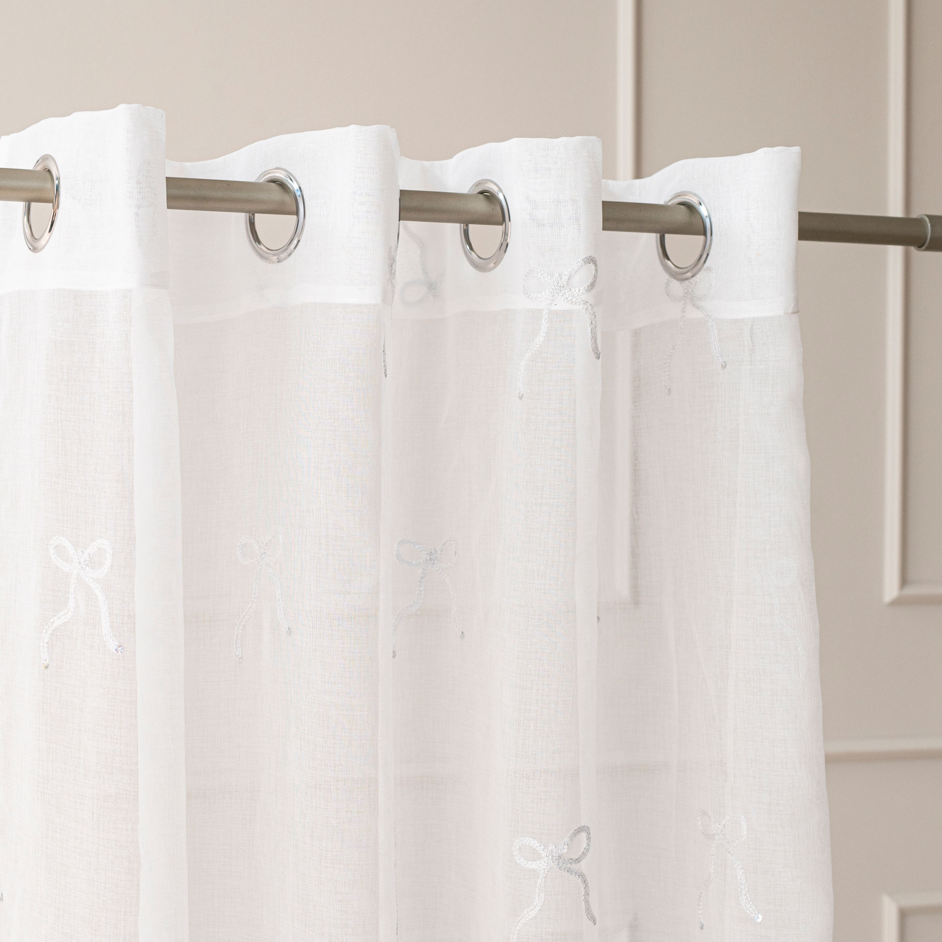 Firanka Kokardka to subtelna i niezwykle elegancka dekoracja okienna, wykonana z lekkiej, półprzezroczystej tkaniny w odcieniu bieli. Jej największym atutem są delikatnie błyszczące aplikacje w formie drobnych kokardek rozmieszczonych równomiernie na całej powierzchni. Haftowane ozdoby dodają firanie wdzięku i dziewczęcej lekkości, jednocześnie zachowując gustowny, klasyczny charakter.