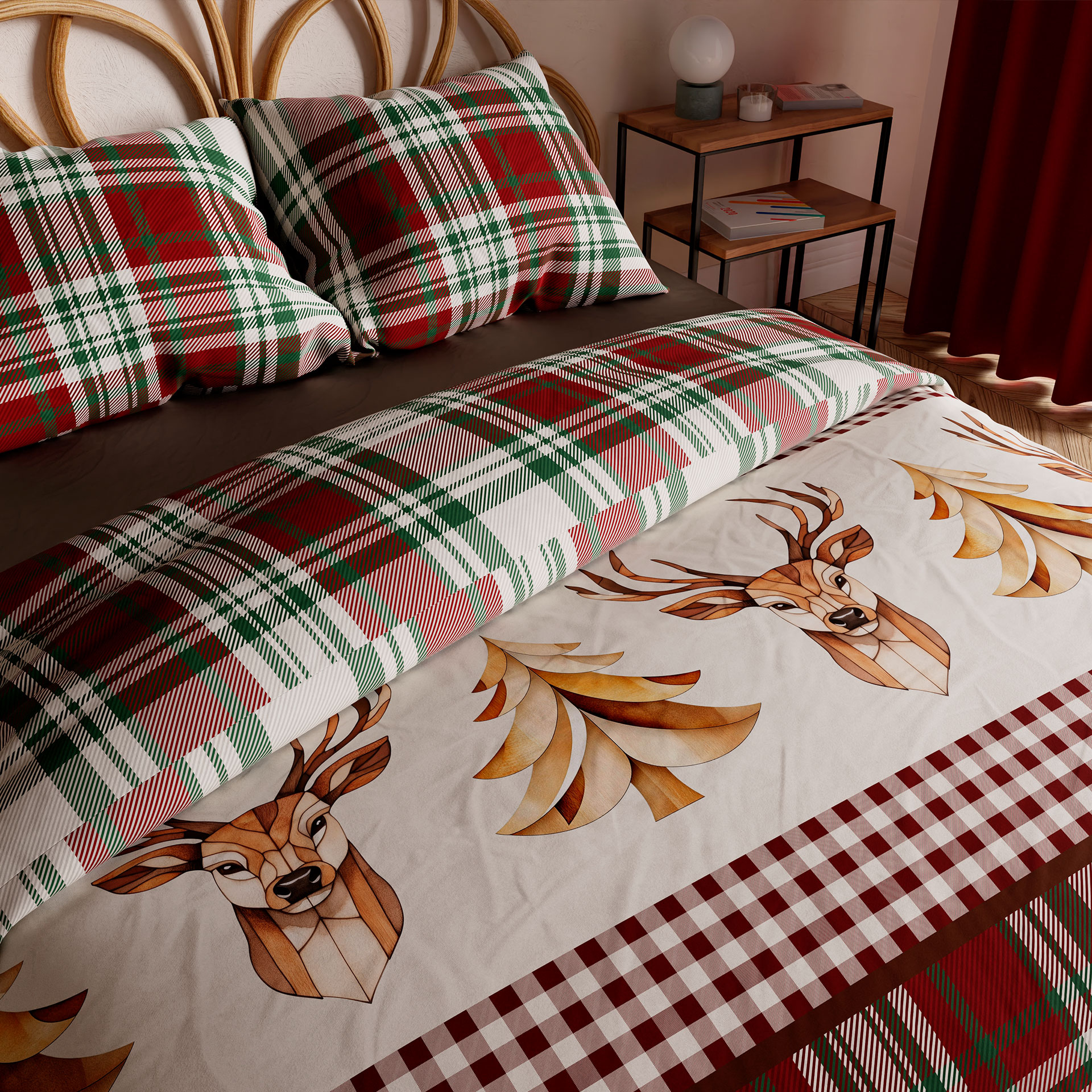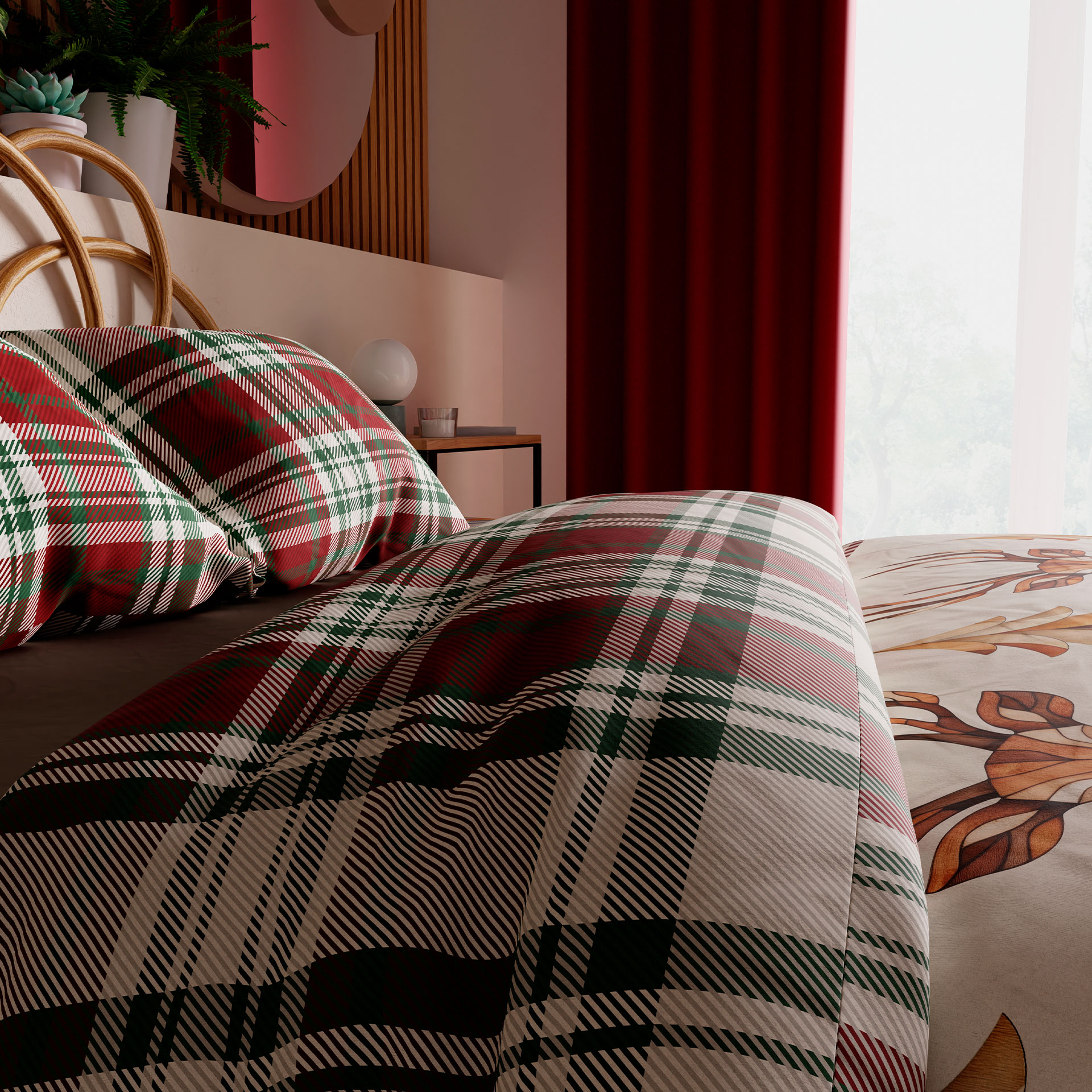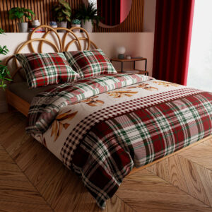 Pościel MERRY to połączenie świątecznej atmosfery i klasycznej elegancji. Ciepła kolorystyka w czerwone i zielone odcienie kratki, uzupełniona delikatnymi motywami roślinnymi, wprowadza do sypialni przytulny a także radosny nastrój.