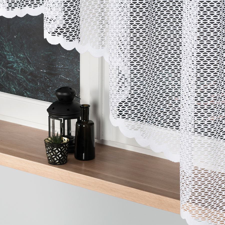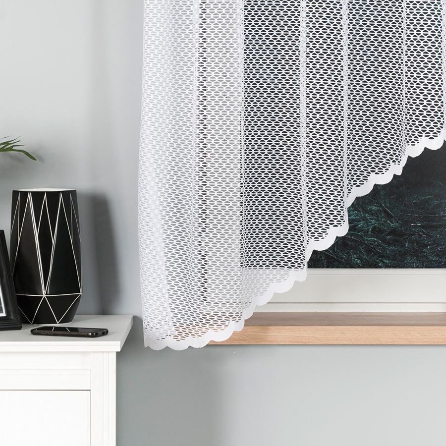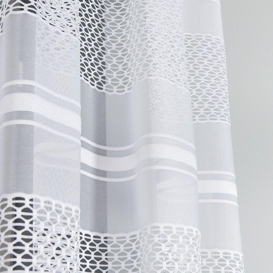 Firanka żakardowa w klasycznym białym kolorze, zdobiona prostym, eleganckim wzorem o uniwersalnym stylu, harmonijnie wpisuje się zarówno w tradycyjne, jak i nowoczesne aranżacje. Lekka tkanina subtelnie przepuszcza światło, wprowadzając do wnętrza ciepło i przytulną atmosferę.
