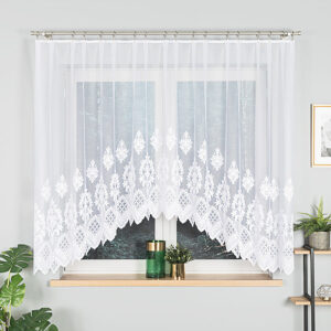 Ludmiła firanka żakardowa w białym kolorze, ozdobiona eleganckim wzorem roślinnym. Dekoracyjne, łukowe wykończenie dołu dodaje lekkości i finezji. Firanka z taśmą marszczącą, łatwa w zawieszeniu, delikatnie rozprasza światło, tworząc klasyczny, przytulny klimat. Wykonana z wysokiej jakości żakardu co więcej cechuje się subtelnym blaskiem i trwałością.