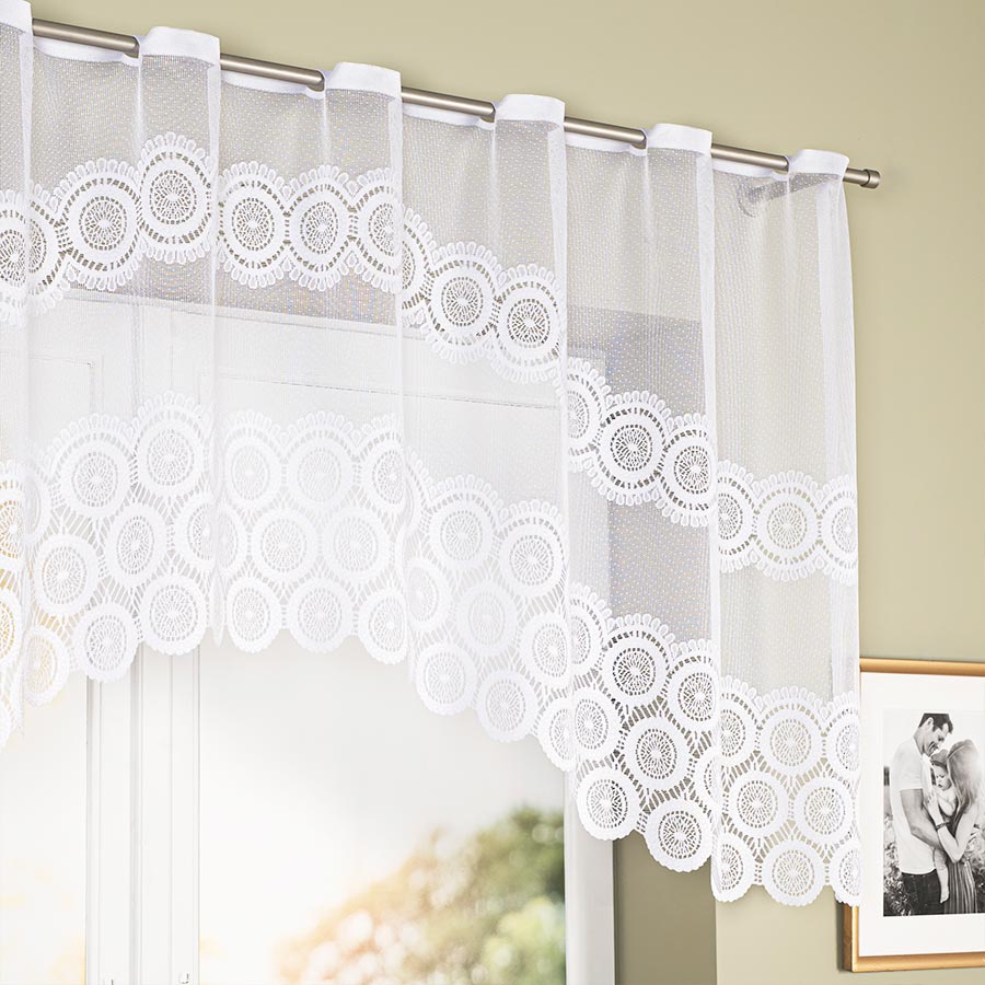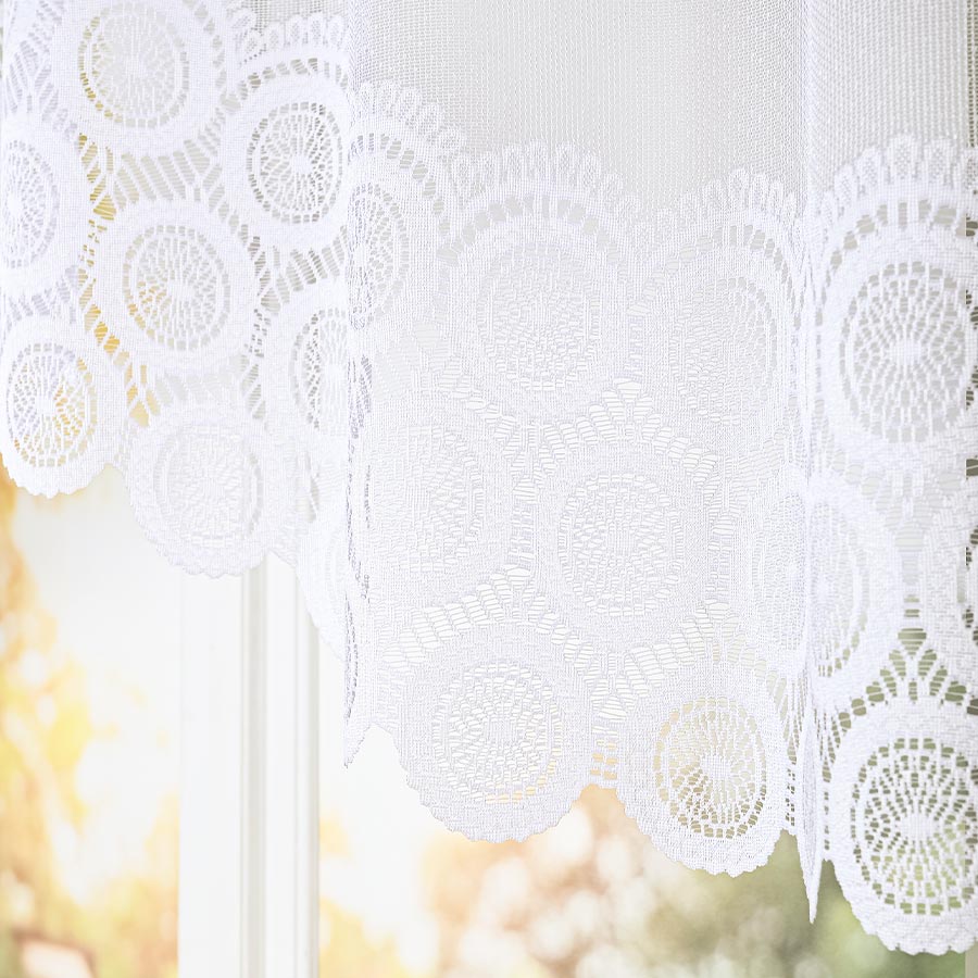Malwina firanka żakardowa w klasycznej bieli, ozdobiona eleganckim wzorem o kolistych motywach, doskonale komponuje się z tradycyjnymi i nowoczesnymi wnętrzami. Dekoracyjny dół wykończony w formie łuku dodaje lekkości i subtelnej elegancji. Wysokiej jakości tkanina delikatnie przepuszcza światło, tworząc w pomieszczeniu ciepły i przytulny klimat. Wykonana z wysokiej jakości żakardu co więcej cechuje się subtelnym blaskiem i trwałością.