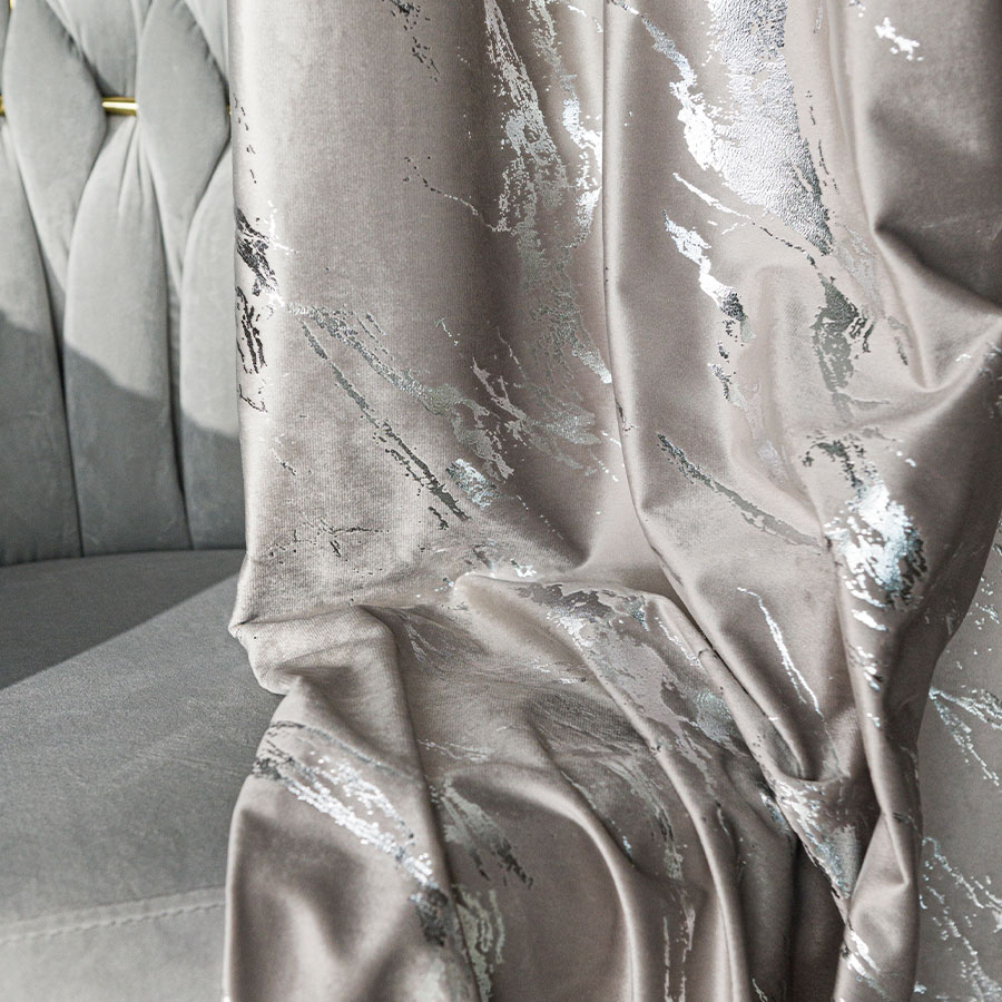 srebrny nadruk- wzór marmuru to prawdziwa ozdoba, która odbija światło, tworząc efektowną grę cieni i blasku w Twoim wnętrzu ponadto wzór marmurowy dodaje zasłonie szlachetności, jednocześnie nadając jej nowoczesny i elegancki charakter. Zastosowanie przelotek zapewnia łatwość w zawieszeniu, a same przelotki podkreślają prostotę i nowoczesność produktu.