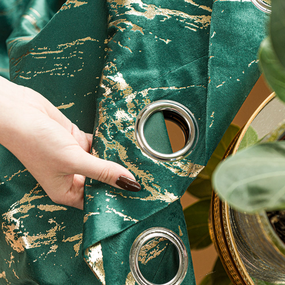 Złoty nadruk- wzór marmuru to prawdziwa ozdoba, która odbija światło, tworząc efektowną grę cieni i blasku w Twoim wnętrzu ponadto wzór marmurowy dodaje zasłonie szlachetności, jednocześnie nadając jej nowoczesny i elegancki charakter. Zastosowanie przelotek zapewnia łatwość w zawieszeniu, a same przelotki podkreślają prostotę i nowoczesność produktu.