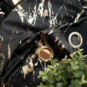 Złoty nadruk- wzór marmuru to prawdziwa ozdoba, która odbija światło, tworząc efektowną grę cieni i blasku w Twoim wnętrzu ponadto wzór marmurowy dodaje zasłonie szlachetności, jednocześnie nadając jej nowoczesny i elegancki charakter. Zastosowanie przelotek zapewnia łatwość w zawieszeniu, a same przelotki podkreślają prostotę i nowoczesność produktu.