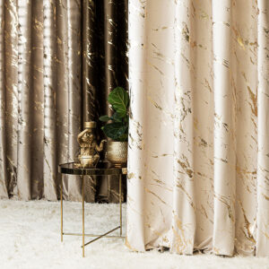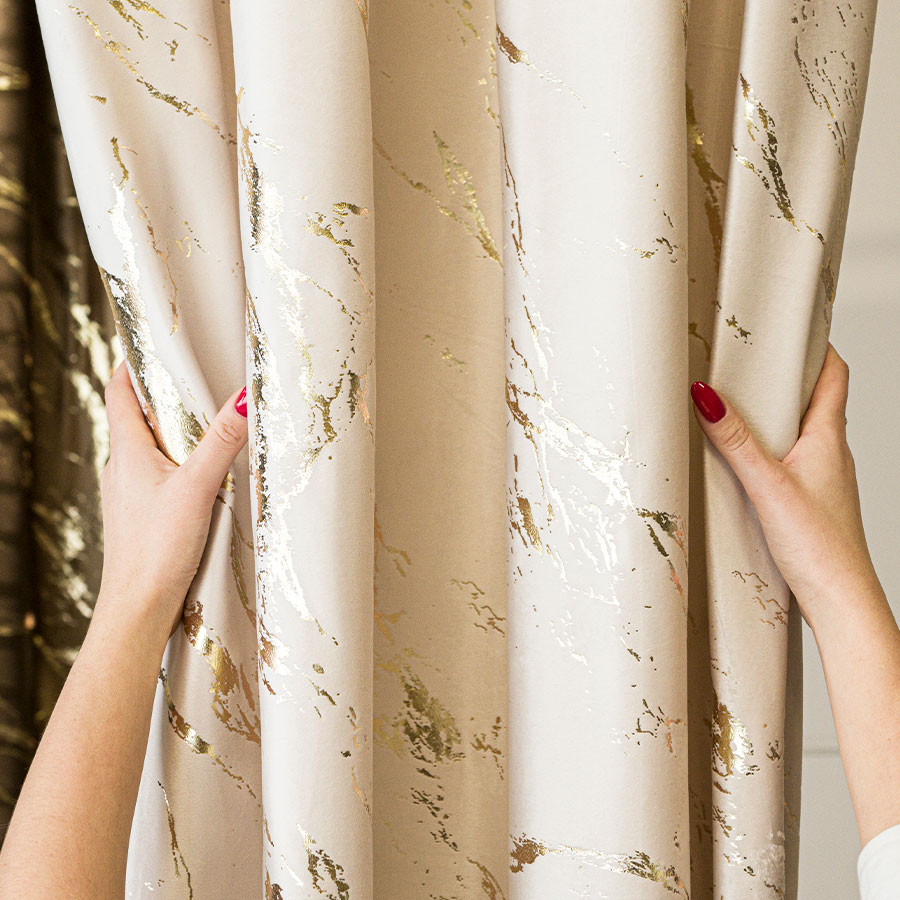 Złoty nadruk- wzór marmuru to prawdziwa ozdoba, która odbija światło, tworząc efektowną grę cieni i blasku w Twoim wnętrzu ponadto wzór marmurowy dodaje zasłonie szlachetności, jednocześnie nadając jej nowoczesny i elegancki charakter. Zastosowanie przelotek zapewnia łatwość w zawieszeniu, a same przelotki podkreślają prostotę i nowoczesność produktu.