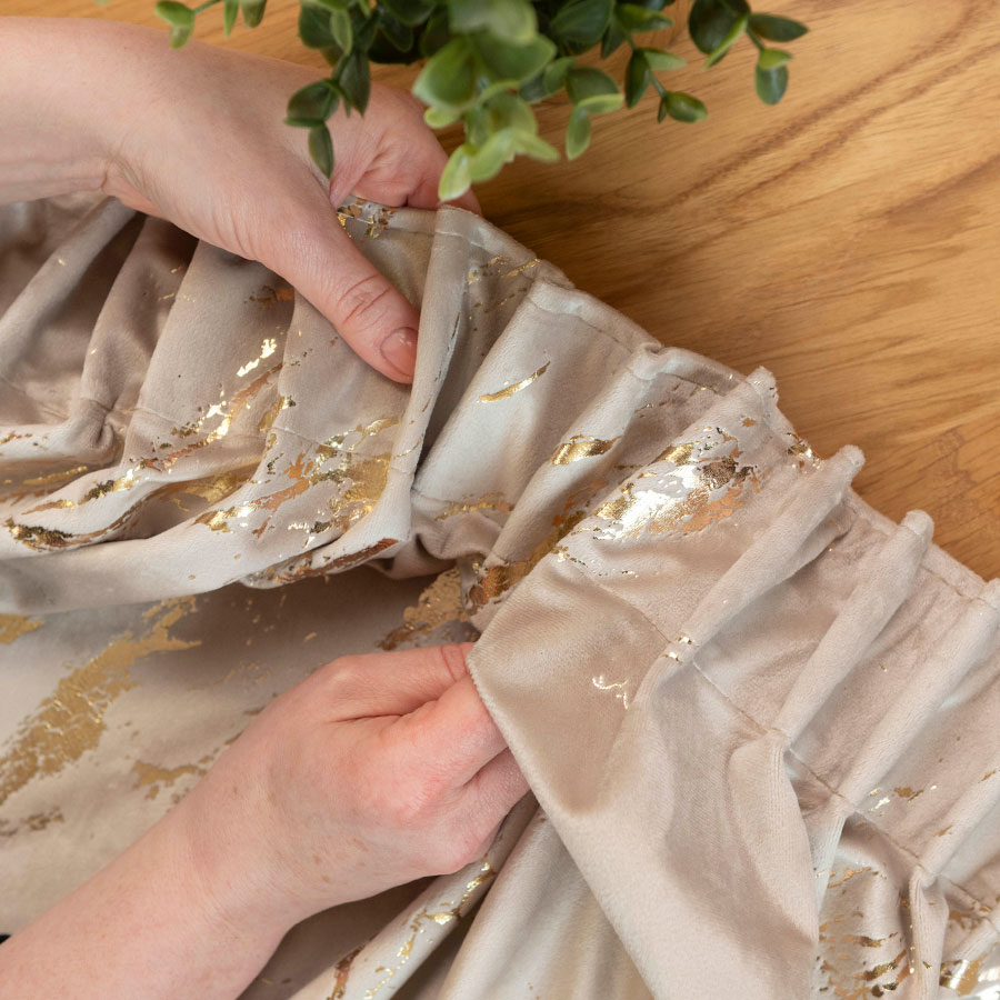 Złoty nadruk- wzór marmuru to prawdziwa ozdoba, która odbija światło, tworząc efektowną grę cieni i blasku w Twoim wnętrzu ponadto wzór marmurowy dodaje zasłonie szlachetności, jednocześnie nadając jej nowoczesny i elegancki charakter. Zastosowanie taśmy zapewnia łatwość w zawieszeniu, ponadto podkreśla prostotę i nowoczesność produktu.
