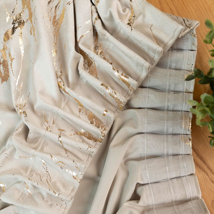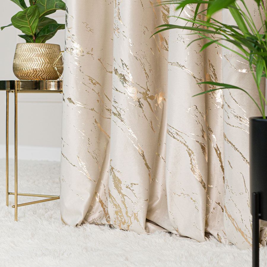 Złoty nadruk- wzór marmuru to prawdziwa ozdoba, która odbija światło, tworząc efektowną grę cieni i blasku w Twoim wnętrzu ponadto wzór marmurowy dodaje zasłonie szlachetności, jednocześnie nadając jej nowoczesny i elegancki charakter. Zastosowanie taśmy zapewnia łatwość w zawieszeniu, ponadto podkreśla prostotę i nowoczesność produktu.