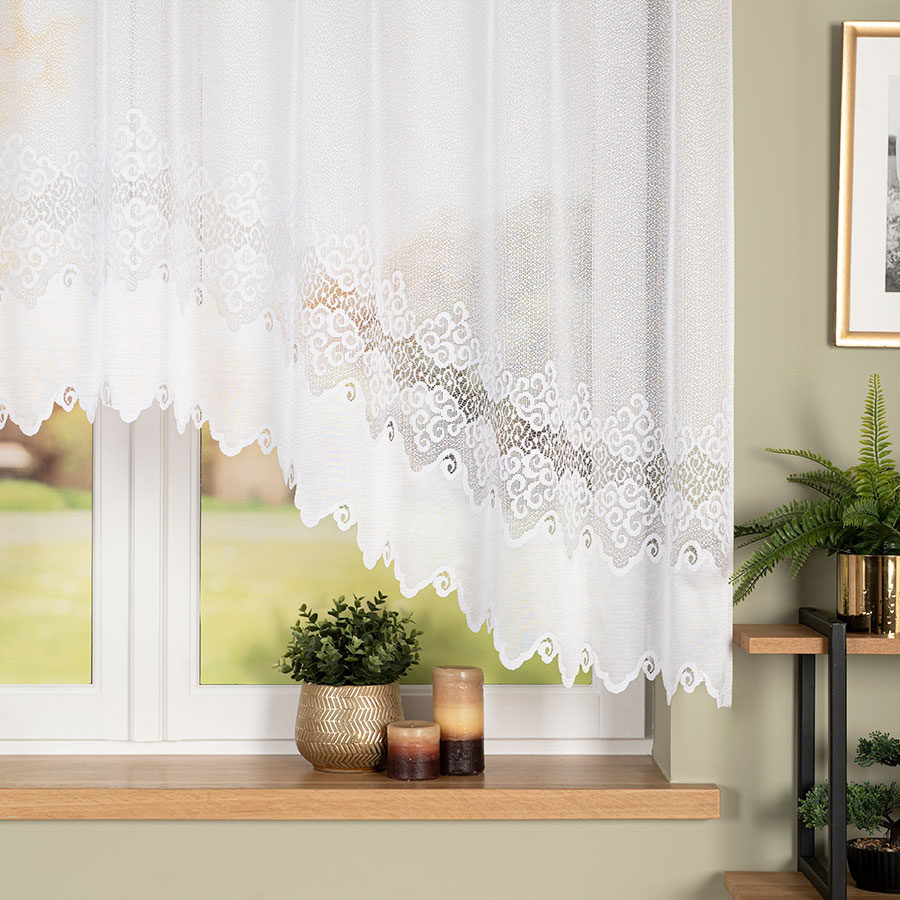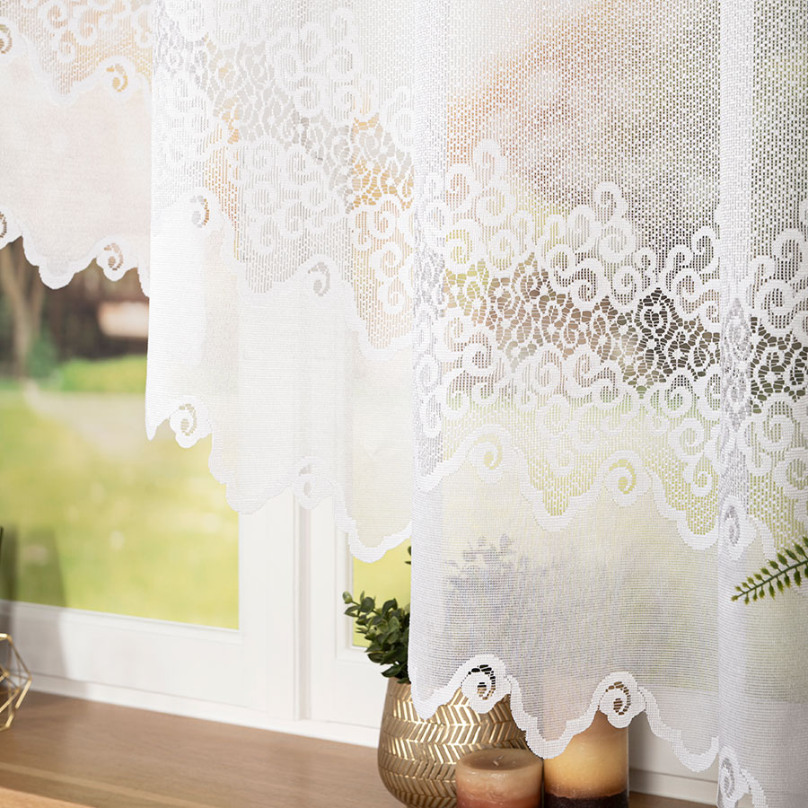 - Wzór: Delikatna firana z eleganckim ornamentowym wzorem i ozdobnym, łukowym wykończeniem u dołu.