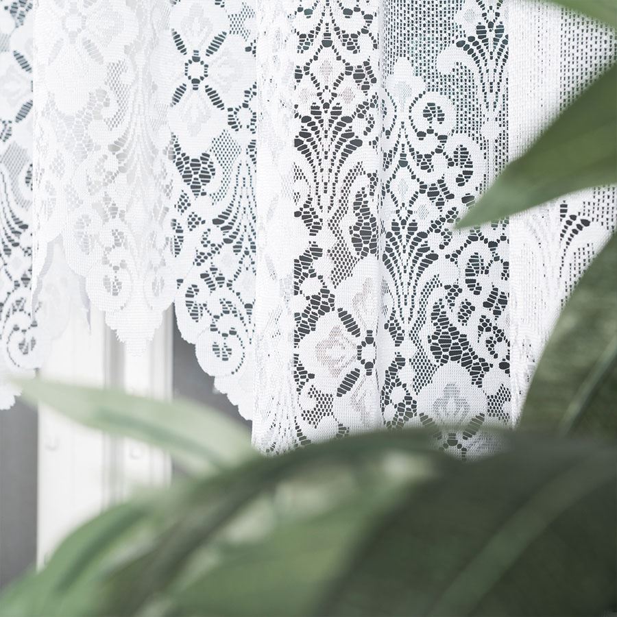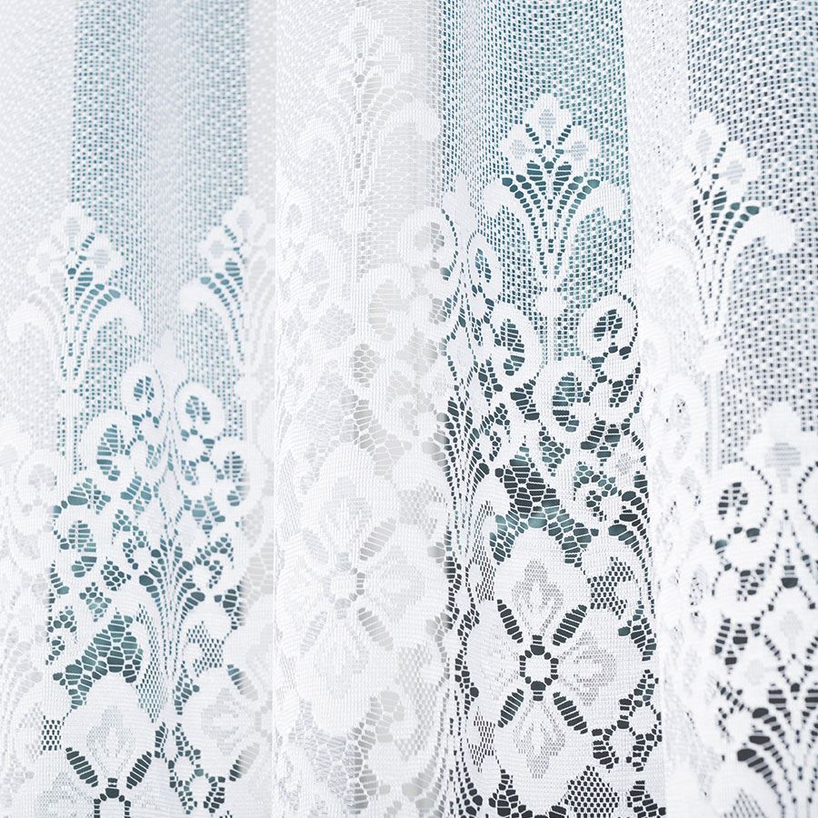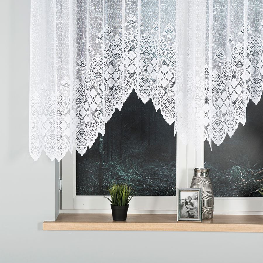 Nadia firanka żakardowa w kolorze białym jest zdobiona geometryczno-roślinnym wzorem. Posiada łukowe wykończenie dołu i taśmę marszczącą ułatwiającą zawieszenie ponadto jest lekka i przejrzysta, subtelnie rozprasza światło, nadając wnętrzu klasyczny charakter. Idealna do kuchni, jadalni lub salonu.