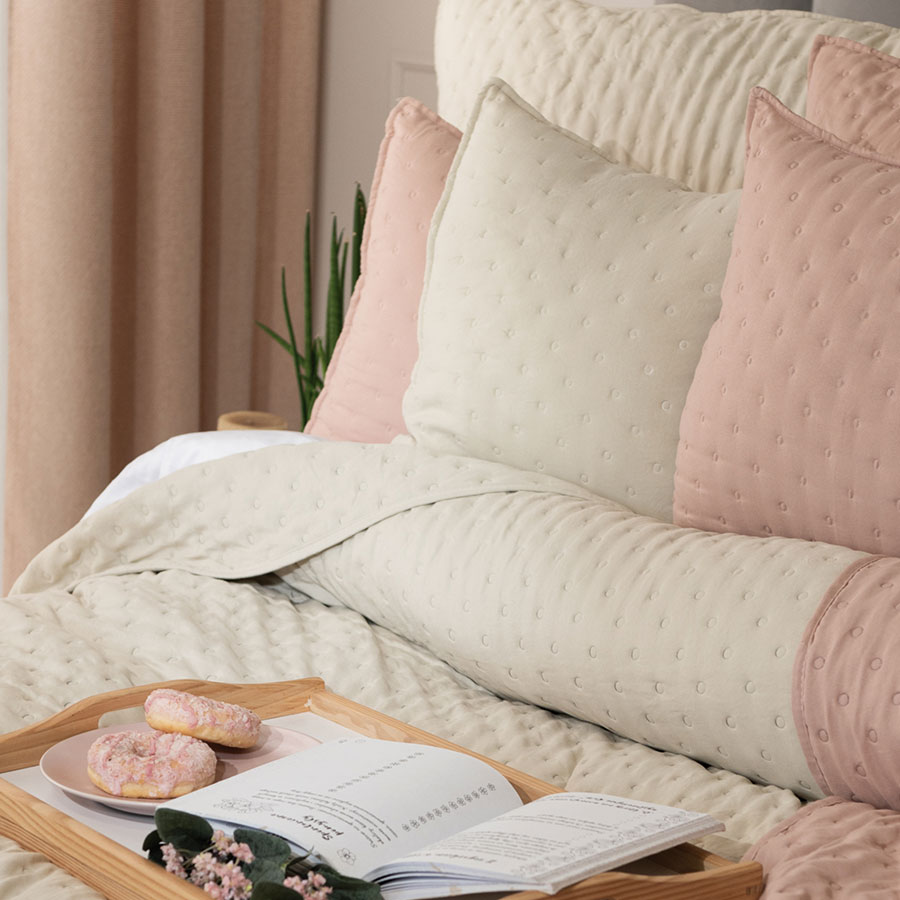 Narzuta NULES w subtelnym beżowym odcieniu to doskonały wybór dla miłośników nowoczesnego minimalizmu. Pikowana struktura nadaje jej elegancki, a zarazem przytulny charakter. Dzięki niej sypialnia zyskuje uporządkowany i stylowy wygląd, a cała aranżacja nabiera świeżości i harmonii. Narzuta NULES to nie tylko dekoracyjny akcent, ale także praktyczne rozwiązanie na co dzień.