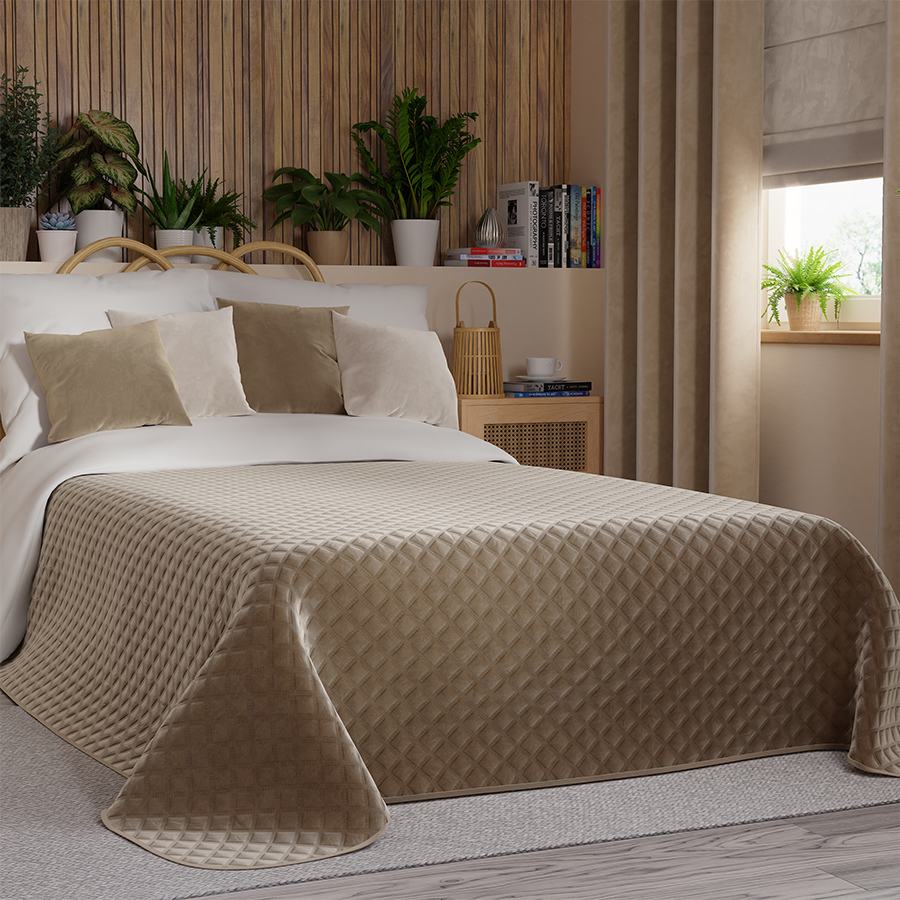 Narzuta VELVI w odcieniu ciemno beżowym to połączenie nowoczesnej elegancji i codziennej wygody. Jej miękka, pikowana tkanina ozdobiona geometrycznym wzorem nie tylko przyciąga wzrok, ale też wprowadza do wnętrza wyrafinowaną prostotę. Doskonale sprawdzi się jako dekoracyjny element łóżka, jednocześnie chroniąc pościel i podkreślając estetykę sypialni. To idealny wybór dla tych, którzy cenią styl, porządek i funkcjonalność w jednym.
