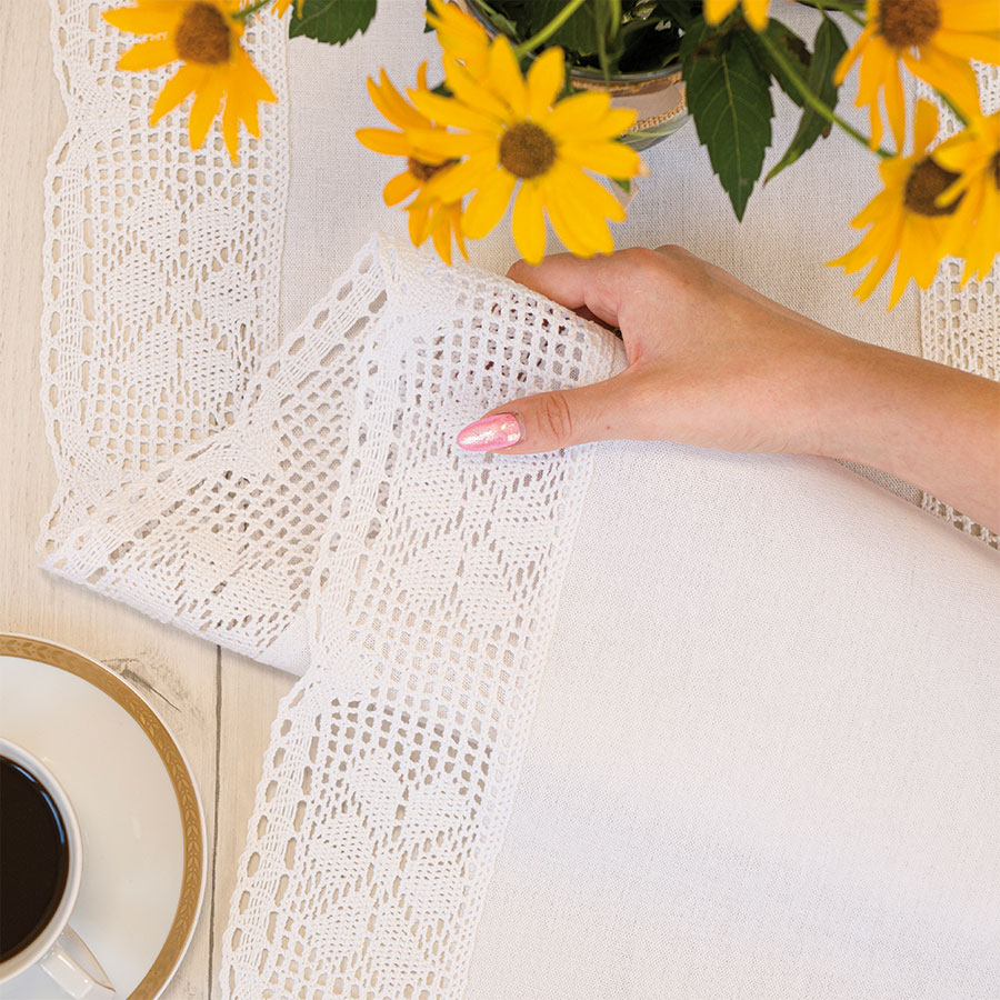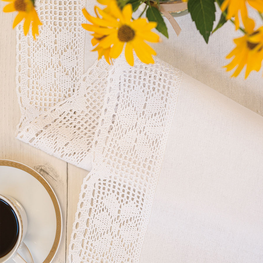 Bieżnik RACHELA to esencja elegancji i ponadczasowego stylu. Wykonany z wysokiej jakości białej tkaniny, ozdobiony misterną ażurową koronką w kwiatowy wzór, doskonale komponuje się zarówno z klasycznymi, jak i rustykalnymi aranżacjami wnętrz. Subtelny ażur nadaje mu lekkości i romantycznego uroku, tworząc ciepłą, domową atmosferę.