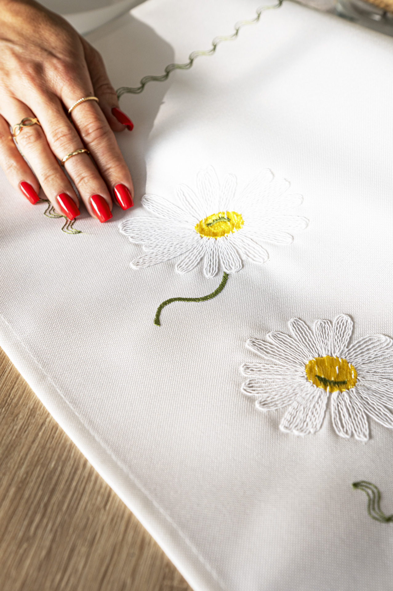 Wprowadź letni nastrój do swojego wnętrza dzięki serwecie SUMMER z uroczym haftem stokrotek. Jasna a także kremowa tkanina ozdobiona precyzyjnie wykonanym haftem w postaci białych kwiatów z żółtym środkiem oraz dekoracyjnym, zielonym obramowaniem sprawia, że ten serweta to idealny wybór na sezon wiosenno-letni.