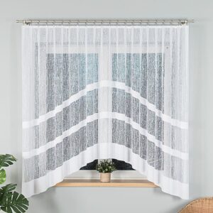 Wiktoria firanka żakardowa w białym kolorze, zdobiona prostym, klasycznym wzorem. Dekoracyjny dół w formie łuku dodaje lekkości i uroku. Transparentna tkanina delikatnie przepuszcza światło, tworząc przytulną atmosferę. Zintegrowana taśma marszcząca umożliwia łatwe zawieszenie i estetyczne ułożenie na oknie. Wykonana z wysokiej jakości żakardu co więcej cechuje się subtelnym blaskiem i trwałością.