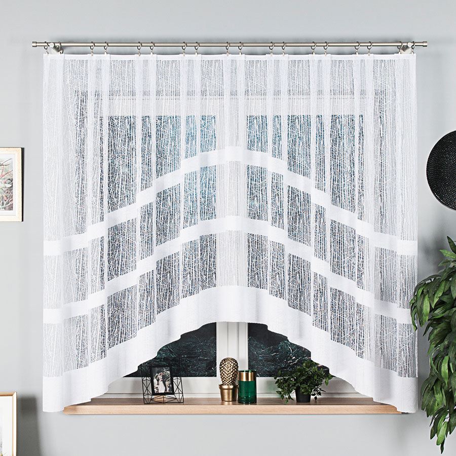 - Wzór: Delikatna firana z prostym klasycznym wzorem i dekoracyjnym łukiem u dołu.
